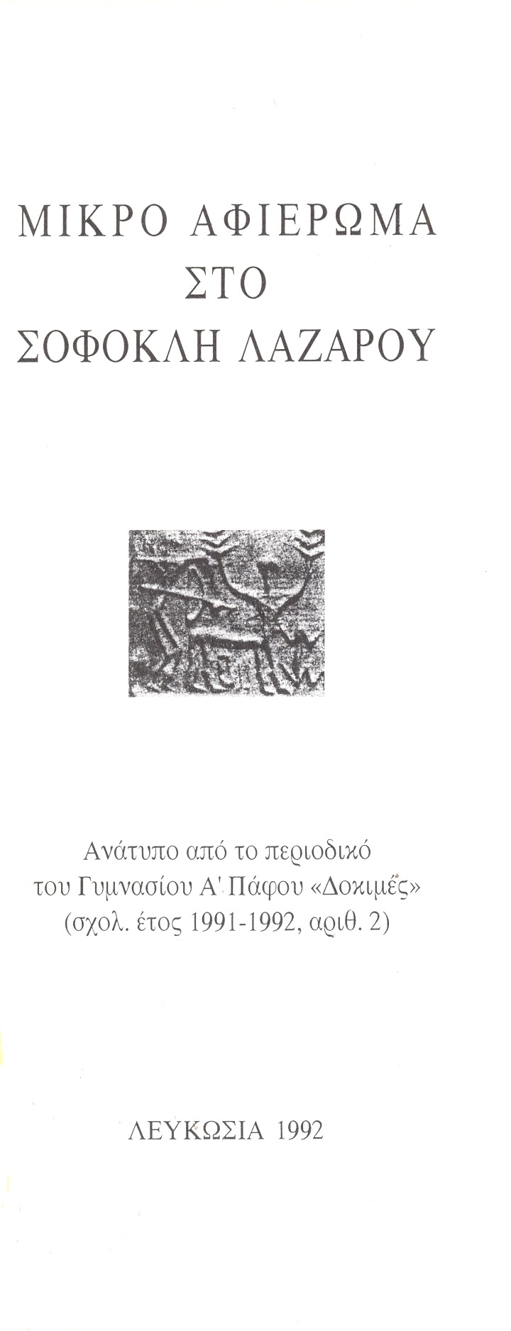 Ανάτυπο από το περιοδικό του Γυμνασίου Α' Πάφου «Δοκιμές» (σχολ. έτος 1991-1992, αριθ. 2).