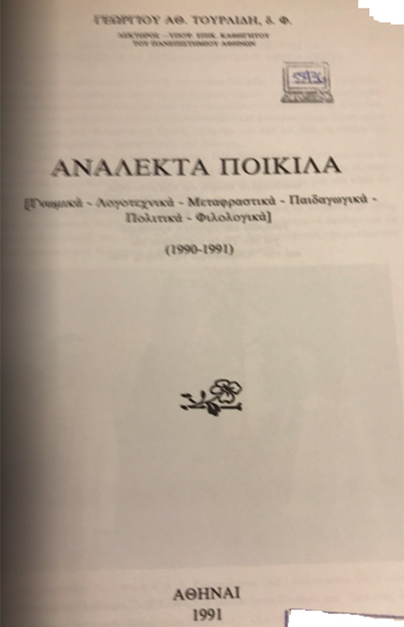 Ανάλεκτα ποικίλα : γνωμικά, λογοτεχνικά, μεταφραστικά, παιδαγωγικά, πολιτικά, φιλολογικά (1990-1991) Γεωργίου Αθ. Τουρλίδη