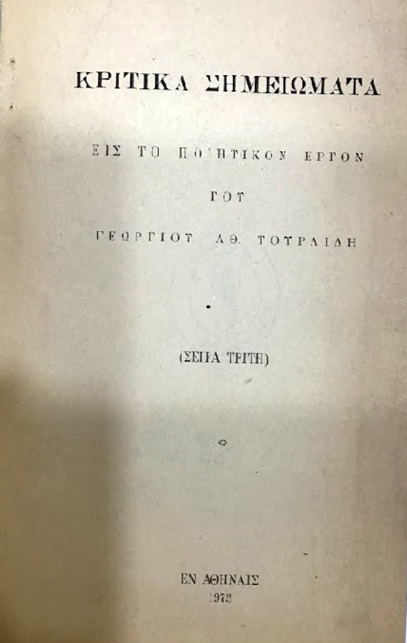 Κριτικά σημειώματα εις το ποιητικόν έργον του Γεωργίου Αθ. Τουρλίδη : σειρά τρίτη.